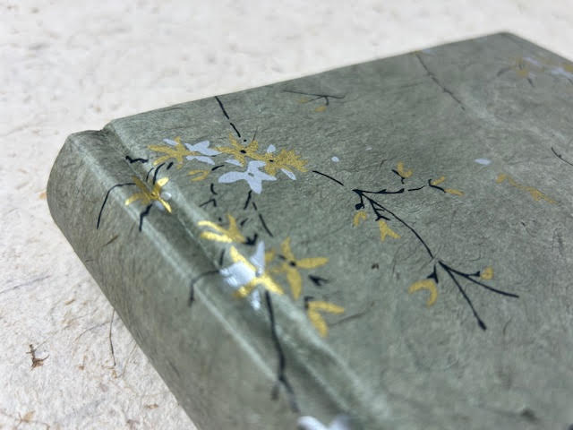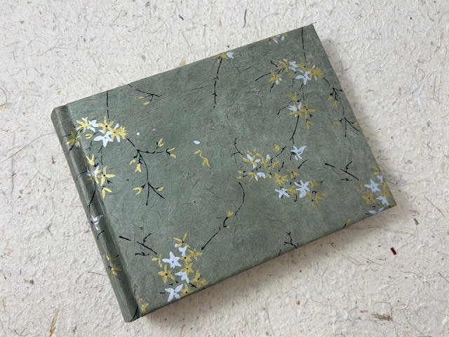 Album fotografico artigianale con copertina imbottita rivestita in carta lokta stampata con rami e fiori di gelsomino. Colori : oro e argento e nero su fondo grigio tortora. Composto di 30 pagine di misura 20 x 15 cm intervallate da velina. Fascetta protettiva in cartone ondulato compresa.