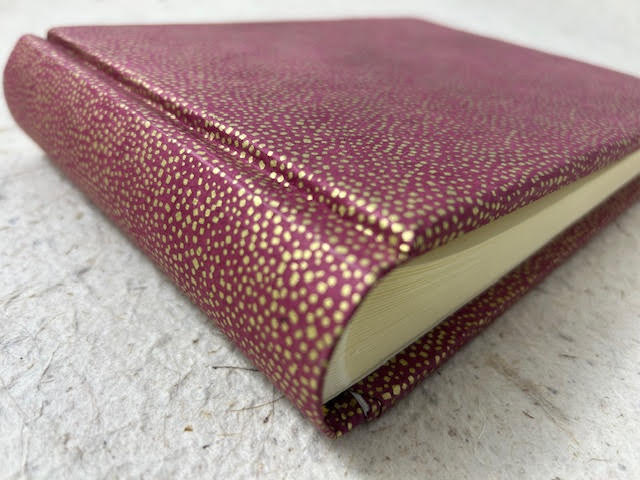 Album fotografico artigianale con copertina imbottita rivestita in carta lokta stampata con piccoli elementi oro su fondo bordeaux. Composto di 30 pagine di misura 20 x 15 cm intervallate da velina. Fascetta protettiva in cartone ondulato compresa.