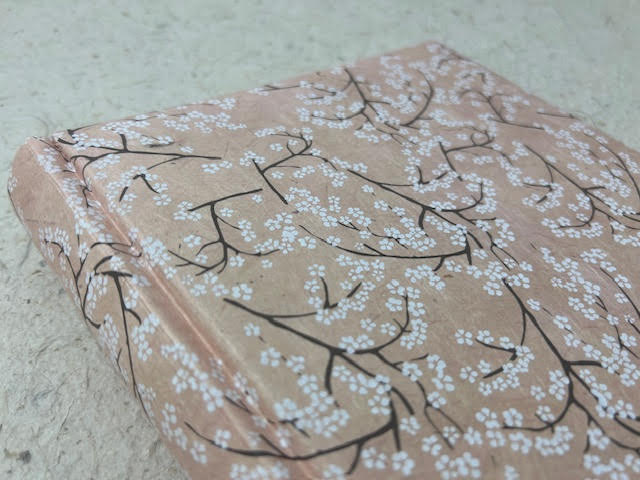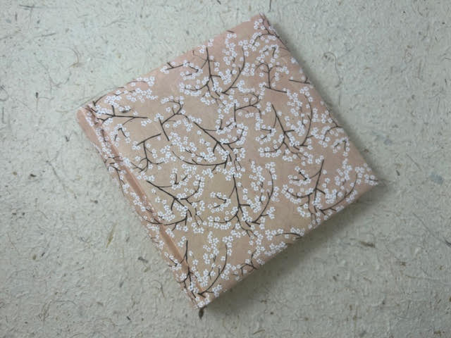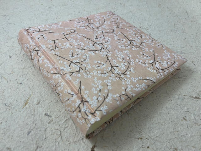 Album fotografico artigianale con copertina imbottita rivestita in carta lokta stampata con fiori di ciliegio bianchi e rami marroni su fondo rosa. Composto di 30 pagine di misura 20 x 20 cm intervallate da velina. Fascetta protettiva in cartone ondulato compresa.