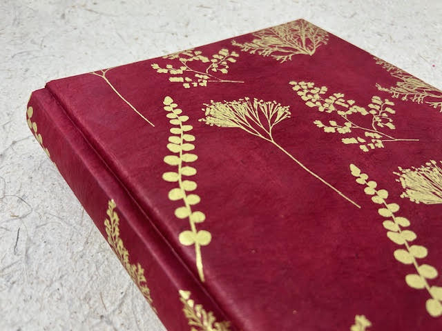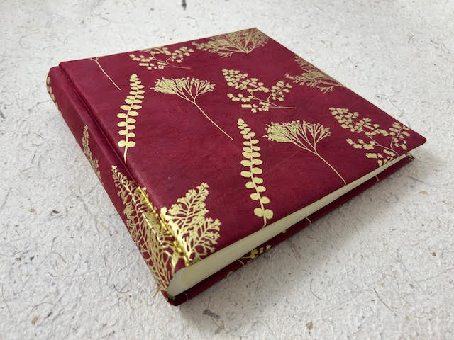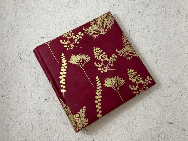 Album fotografico artigianale con copertina imbottita rivestita in carta lokta stampata con stampa botanica in serigrafia. Colore stampa oro su fondo bordeaux. Composto di 30 pagine di misura 23 x 23 cm intervallate da velina. Fascetta protettiva in cartone ondulato compresa.