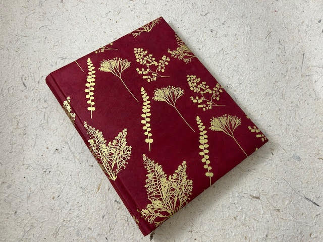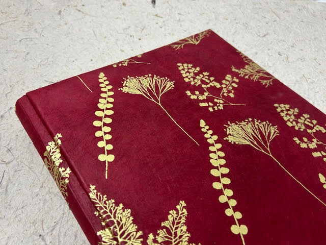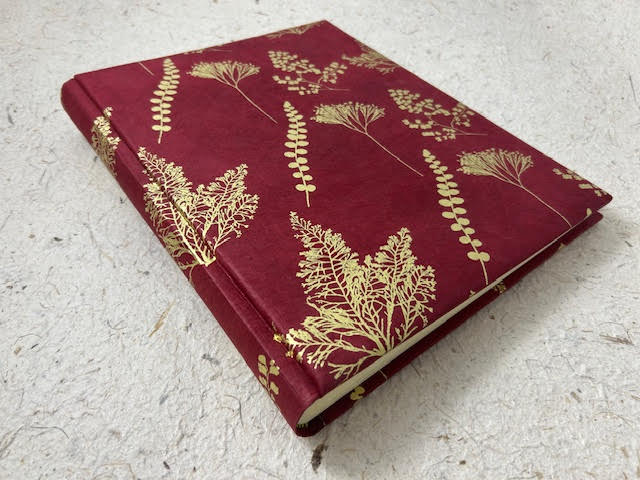 Album fotografico artigianale con copertina imbottita rivestita in carta lokta con stampa botanica oro su fondo bordeaux. Composto di 30 pagine di misura 24 x 30 cm intervallate da velina. Fascetta protettiva in cartone ondulato compresa.