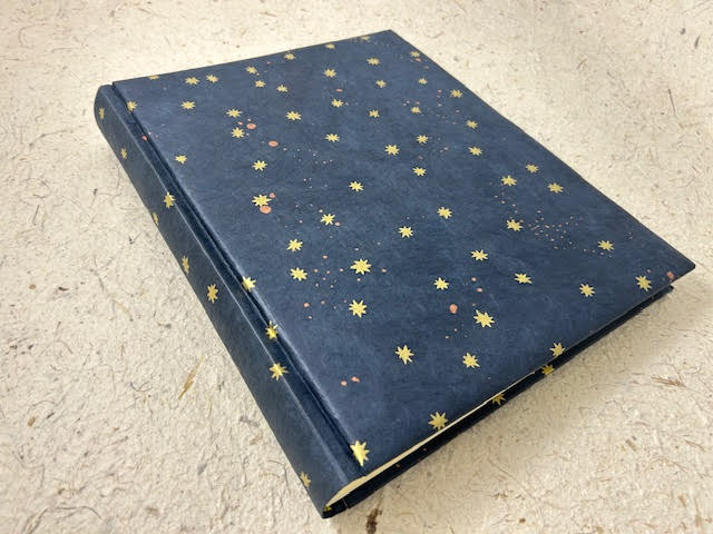 Album fotografico artigianale con copertina imbottita rivestita in carta lokta stampata serigrafica di un cielo stellato : fondo blu e dettagli oro e rame. Composto di 30 pagine di misura 24 x 30 cm intervallate da velina. Fascetta protettiva in cartone ondulato compresa.