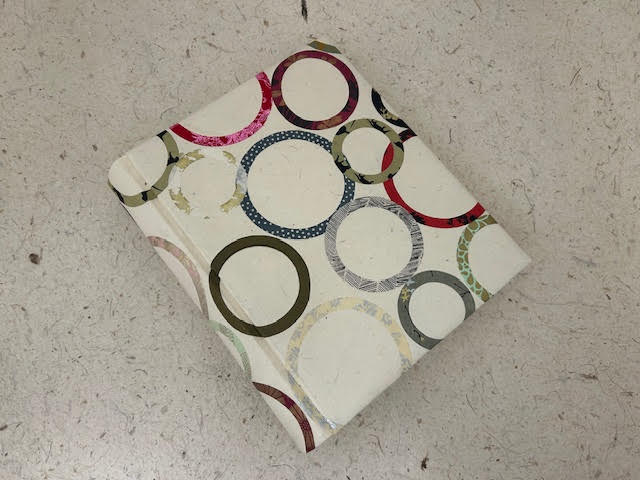 Album fotografico artigianale con copertina imbottita rivestita in carta lokta lavorata a collage con cerchi di varie dimensioni su base chiara. Composto di 60 pagine avorio di misura 24 x 30 cm intervallate da velina. Fascetta protettiva in cartone ondulato compresa.