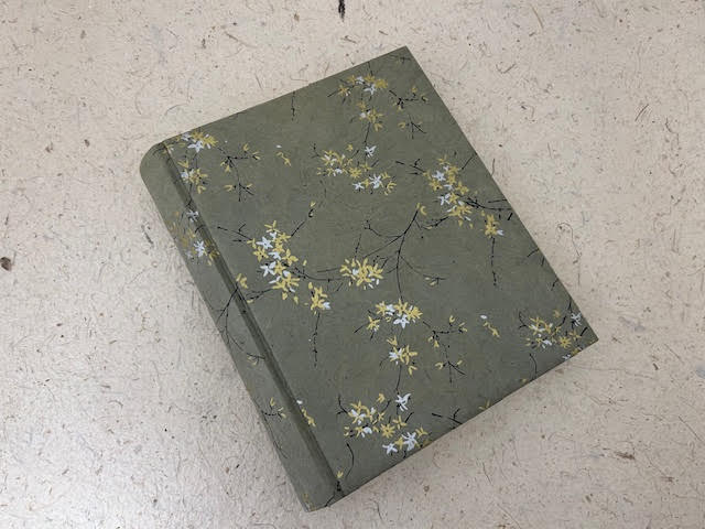 Album fotografico artigianale con copertina imbottita rivestita in carta lokta stampata con elegante fantasia con fiori di gelsomino oro e argento su base tortora. Composto di 60 pagine avorio di misura 24 x 30 cm intervallate da velina. Fascetta protettiva in cartone ondulato compresa.