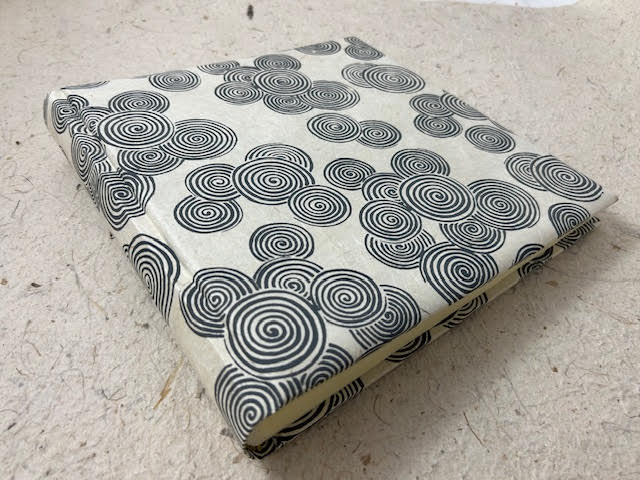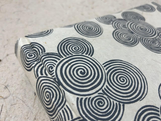 Album fotografico artigianale con copertina imbottita rivestita in carta lokta con stampa serigrafica di spirali grigie su fondo chiaro. Composto di 30 pagine di misura 25 x 25 cm intervallate da velina. Fascetta protettiva in cartone ondulato compresa.