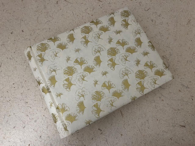 Album fotografico artigianale con copertina imbottita rivestita in carta lokta con stampa serigrafica di eleganti foglie di ginkgo stilizzate oro su fondo chiaro. Composto di 60 pagine avorio di misura 30 x 24 cm intervallate da velina. Fascetta protettiva in cartone ondulato compresa.