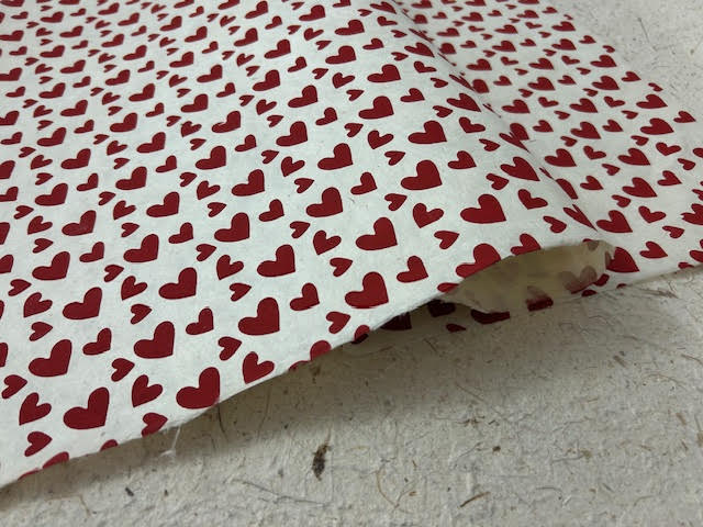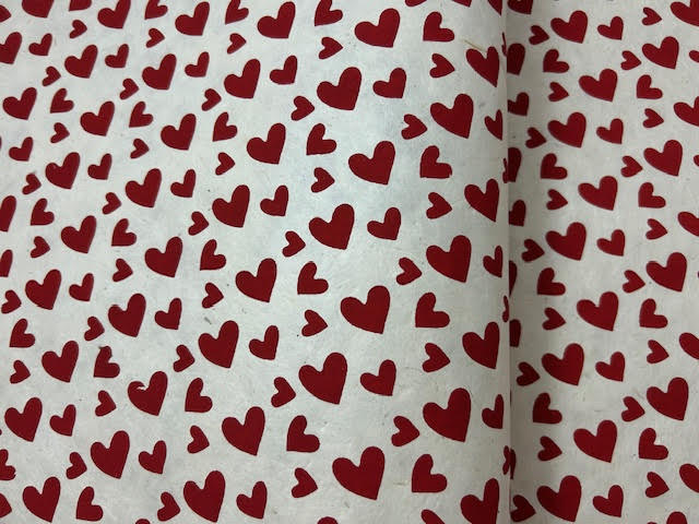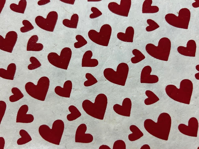Foglio di lokta fatto a mano con stampa serigrafica di cuori rossi con disegno allover su fondo naturale.  Formato 50 x 75 cm