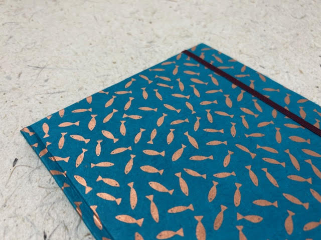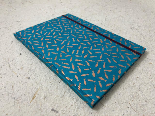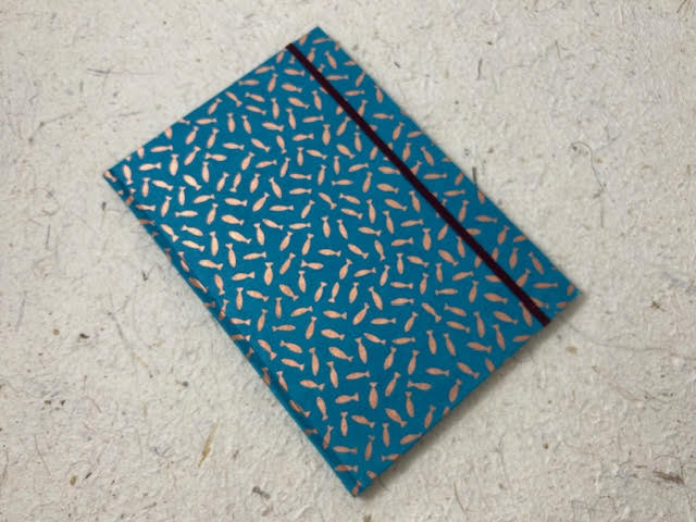 Quaderno dei Pensieri notturni artigianale con copertina cartonata imbottita rivestita in carta lokta con stampa serigrafica di sardine rame su fondo turchese con elastico bordeaux a chiusura. Il quaderno all’interno riporta nella parte superiore di ogni facciata frasi famose riguardanti la notte e simpatici disegni e ha le pagine a righe per facilitare la scrittura. Nelle immagini potete visionare alcune delle pagine presenti all’interno. Formato 17 x 24, composto di 40 pag in carta Arena Ivory Fedrigoni 100 gr. Progetto editoriale Mastri Cartai & Dintorni. Bellissima idea regalo per chi ama scrivere la sera.
