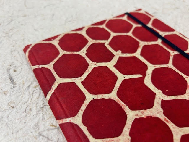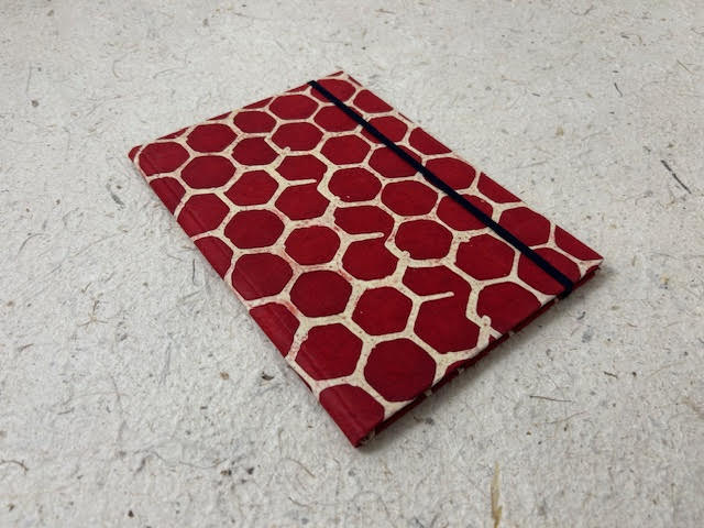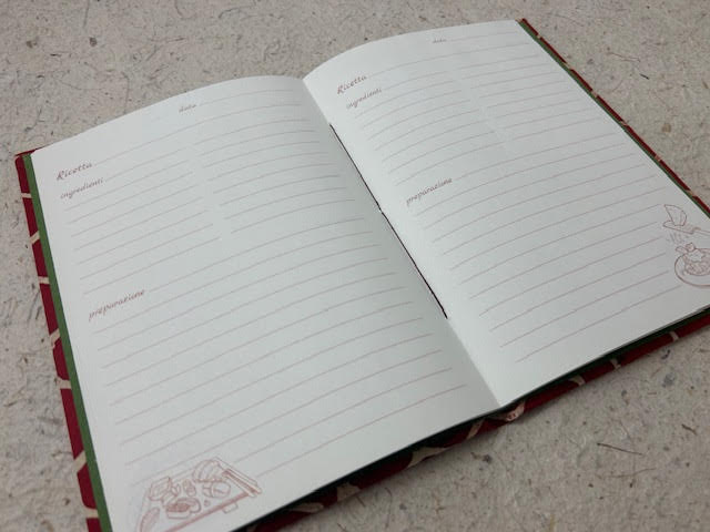 Ricettario artigianale con copertina cartonata rivestita in carta lokta, interno del ricettario composto da 24 pagine di misura 14,5 x 21 cm in carta 90 gr utili per riportare fino a 48 ricette. Chiusura con elastico.