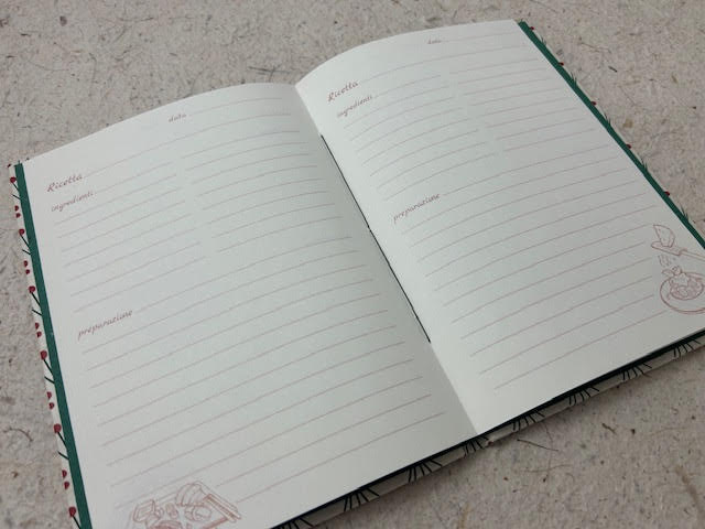 Ricettario artigianale con copertina cartonata rivestita in carta lokta, interno del ricettario composto da 24 pagine di misura 14,5 x 21 cm in carta 90 gr utili per riportare fino a 48 ricette. Chiusura con elastico.