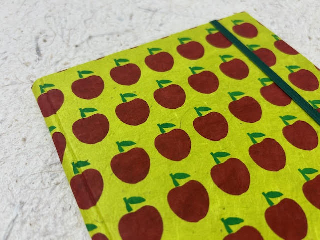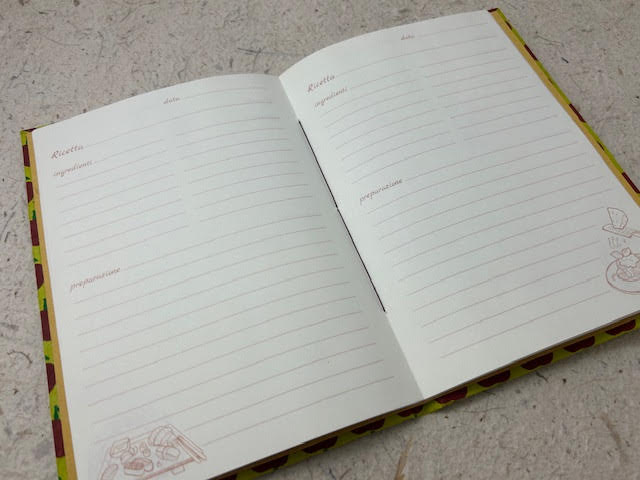 Ricettario artigianale con copertina cartonata rivestita in carta lokta, interno del ricettario composto da 24 pagine di misura 14,5 x 21 cm in carta 90 gr utili per riportare fino a 48 ricette. Chiusura con elastico.
