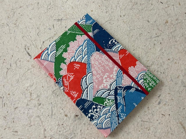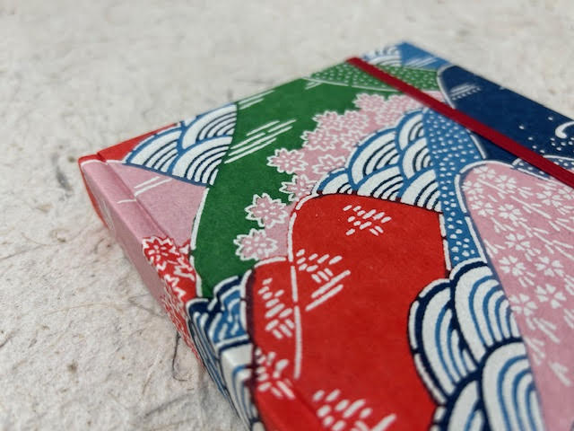 Taccuino artigianale con copertina cartonata rivestita in carta giapponese katazome con stampa serigrafica di montagne multicolor ed elastico rosso. Interno taccuino composto di 128 pagine di misura 12 x 16,5 cm in carta riciclata bianca da 110 gr.