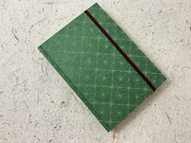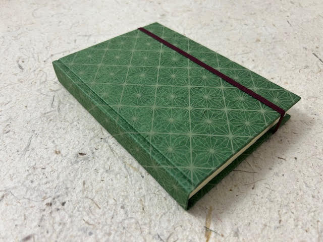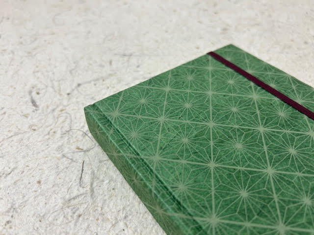 Taccuino artigianale con copertina cartonata rivestita in carta lokta con stampa serigrafica giapponese geometrica verde ed elastico bordeaux. Interno taccuino composto di 144 pagine di misura 12 x 16,5 cm in carta vergata avorio da 90 gr.