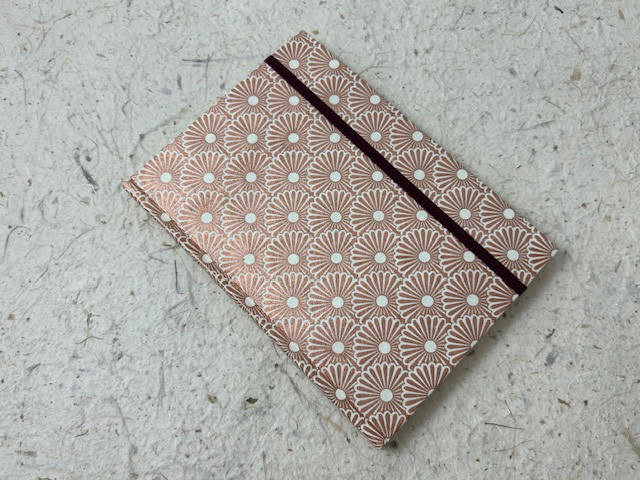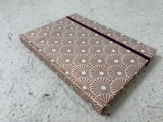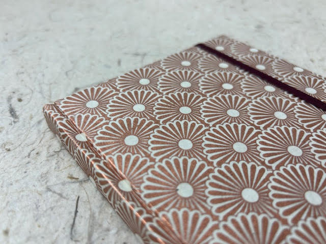 Taccuino artigianale con copertina cartonata rivestita in carta lokta con stampa serigrafica margherite geometriche rame ed elastico bordeaux.  Interno taccuino composto di 72 pagine di misura 12 x 16,5 cm in carta vergata avorio a righe da 90 gr.